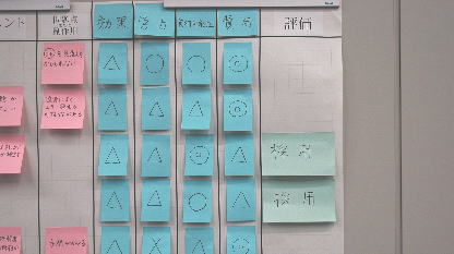 自由な発想で考え出された対策案を一つずつ検討・評価し、実施する対策案を決定します。 まず、別の模造紙の左端に手順4で列挙した対策案を並べて貼り付けます。次に、挙げられている対策案を評価するための評価項目を決めます。評価項目の例として、以下項目があります。